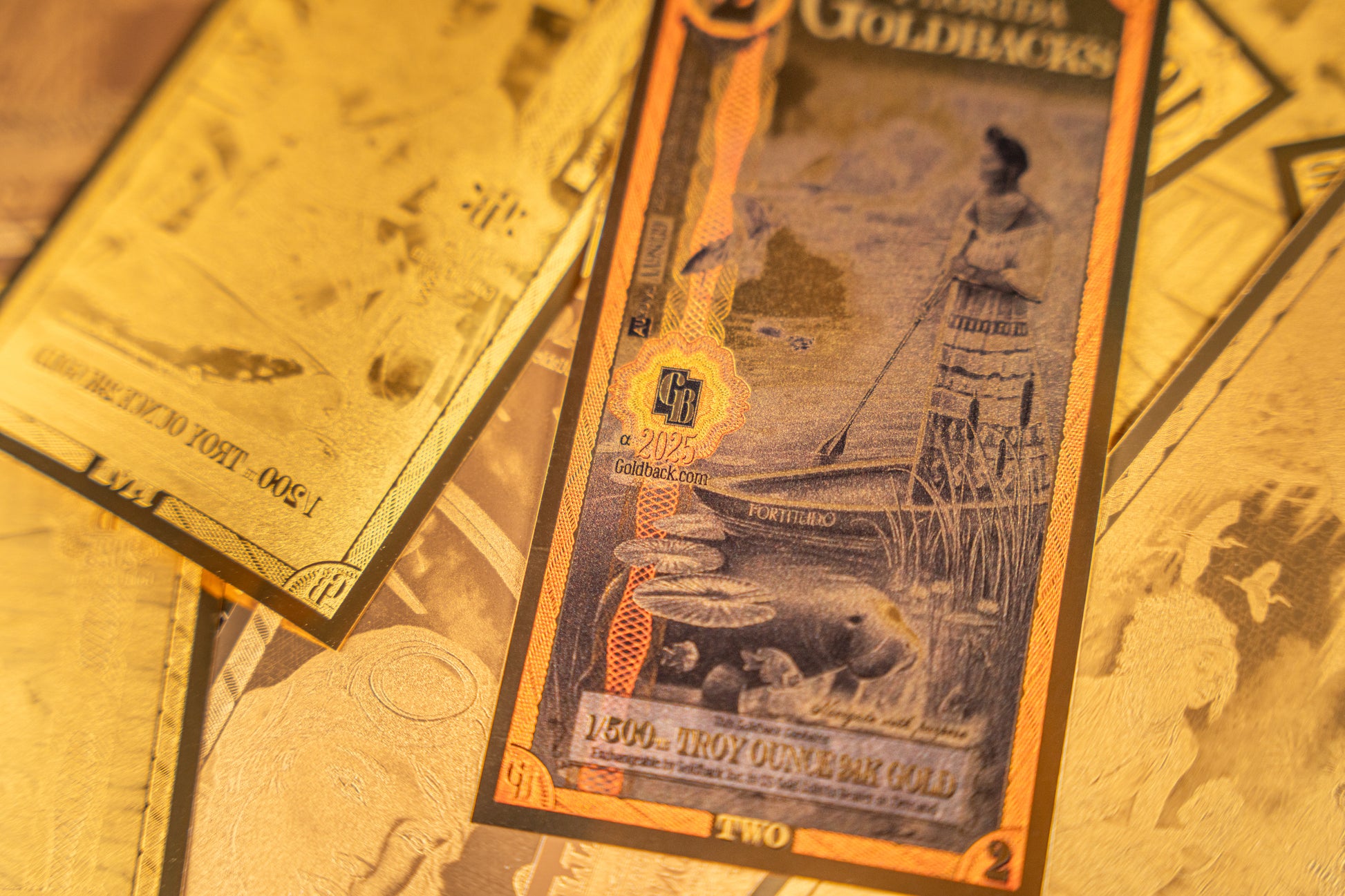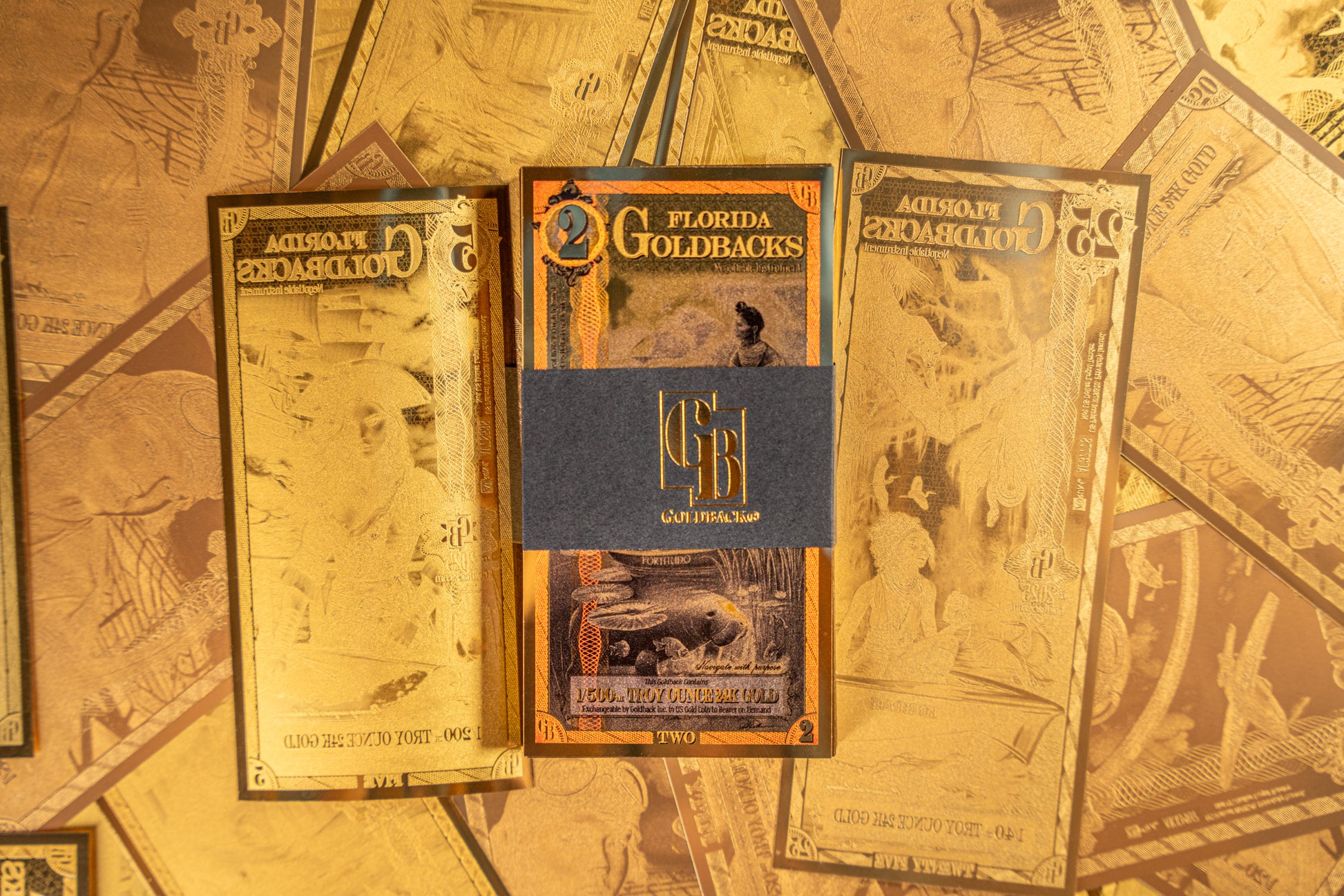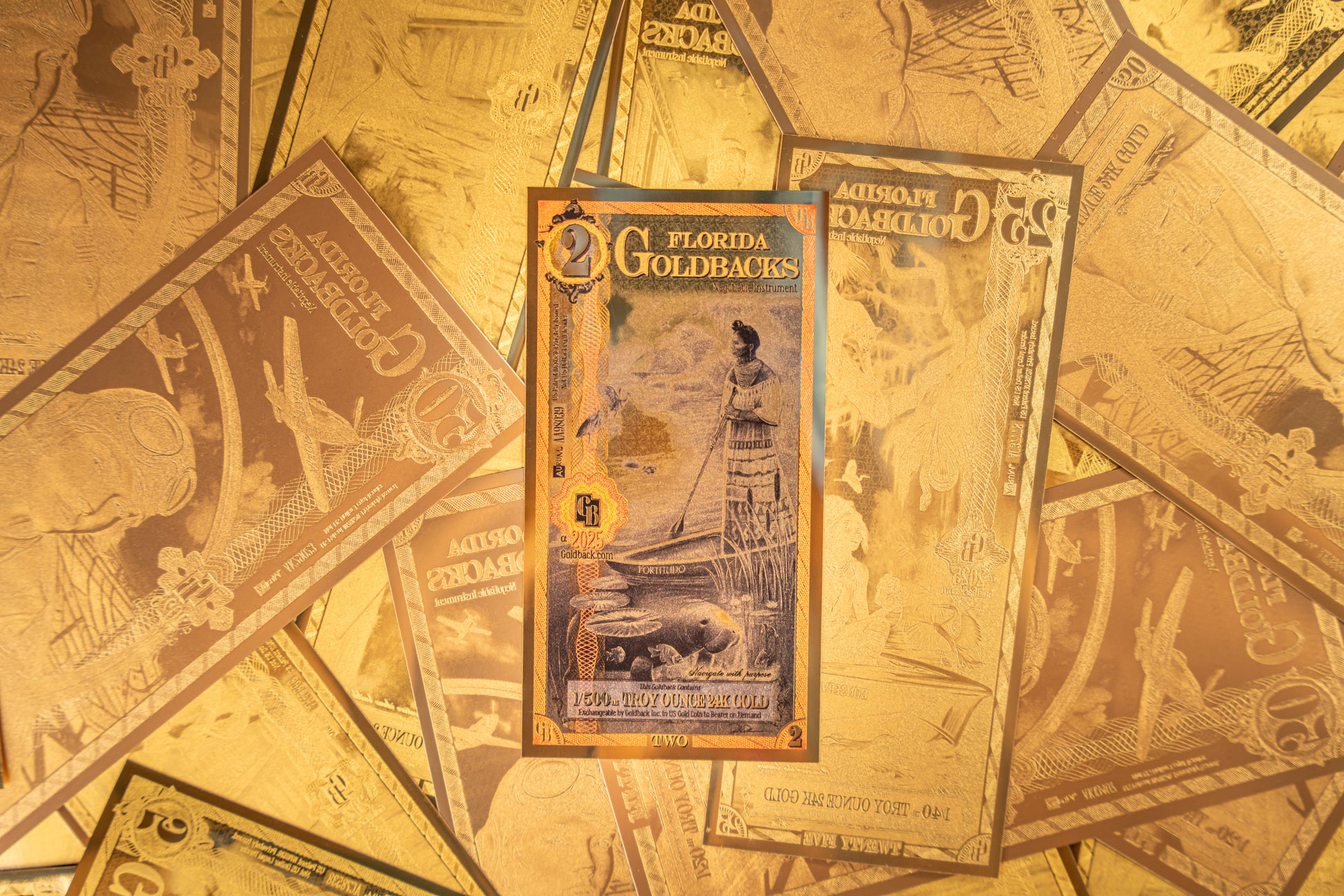 The Florida 2 Goldback features the virtue “Fortitudo,” meaning fortitude or strength, and contains 1/500th of a troy ounce of 24K gold. This elegant and resilient note pays tribute to the enduring spirit of Florida’s communities and ecosystems.