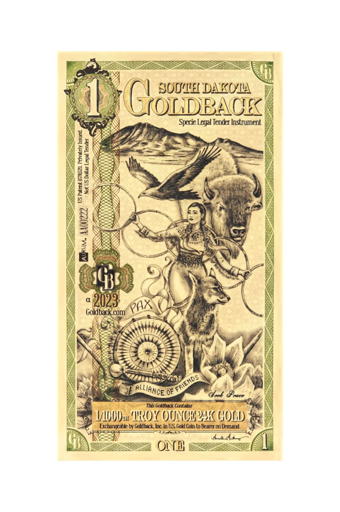 Introducing the South Dakota Alpha Series 1 Goldback, a uniquely designed spendable currency containing exactly 1/1000th of a Troy ounce of pure 24-karat gold. This local currency beautifully embodies "Pax," symbolizing peace, a core virtue artistically depicted through powerful imagery featuring a Native American woman gracefully surrounded by iconic symbols of South Dakota's heritage, including the majestic buffalo and soaring eagle.